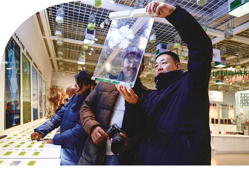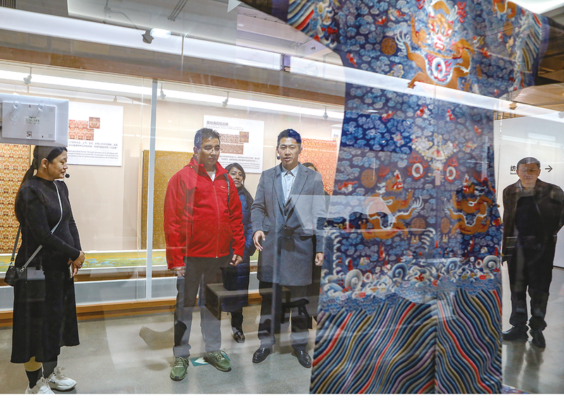 走进愉悦家纺居家世博馆,古代纺织机、龙袍、凤衣,五彩斑斓的扣子、线绳、配件、扎染,看得人眼花缭乱。就尼泊尔客人来说这些稀奇物件都是中国影视剧里才有的东西,既遥远又神秘,这次却鲜活地出现在了他们眼前。他们的相机“咔咔”不停,精心记录着心中的神秘和惊奇。