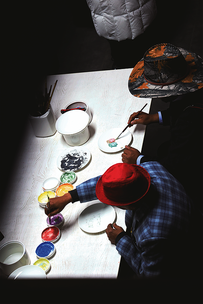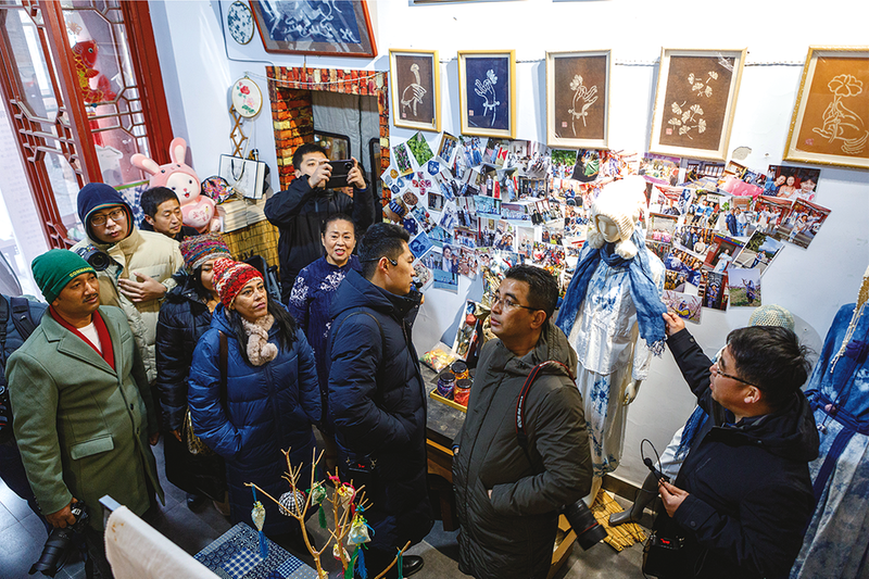 您瞧,五彩斑斓的塘坊糕点滋味飘香,好看好闻更好吃,引得客人连连称赞;将新做的扎染帽子戴在头上,别有一番风味;有的坐上黄包车,有人拉起,小跑一段儿体验中国电影里的旧时光;有的一起做版画,揭开一张象征如意的“天官赐福”;有的动手捏制陶碗陶盆,看泥土在手中千变万化;背靠古色古香的老建筑,手机放出音乐,集体来一段尼泊尔歌舞,献给当地的滨州游客……