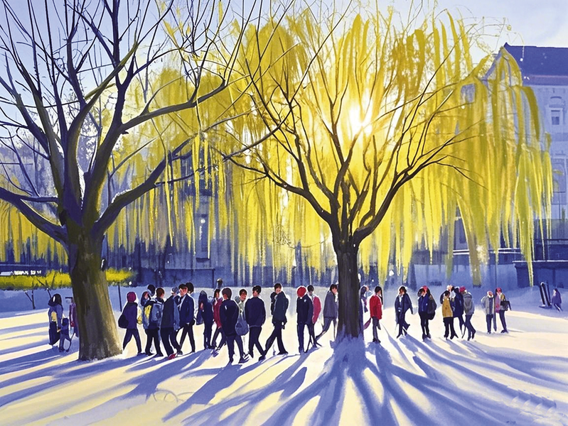 一个初春的早晨,走在通往餐厅的路上,放眼望去,路边的杨柳被春光一浸,不是绿,不是白,是金色,显得更加熠熠生辉。含羞的春阳轻轻地从薄云里探出几缕柔和的光线,地上的人影、树影好像都有些模糊。