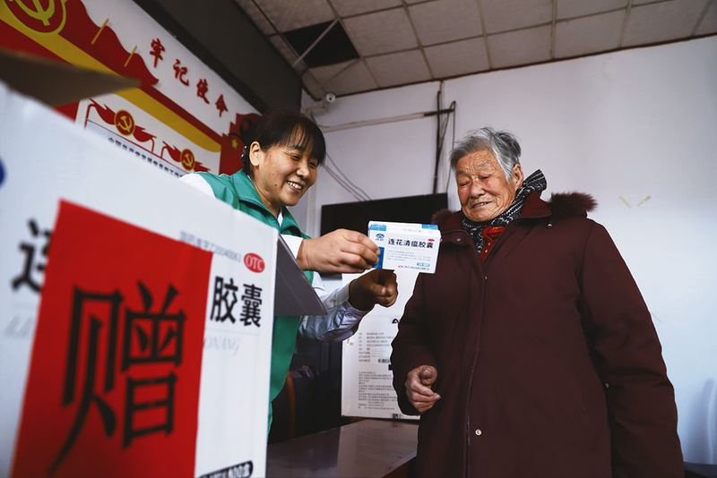 在黄山街道郎君村,村医与社区志愿者一起为老年人免费赠送连花清瘟胶囊,进行流感知识预防宣教,讲解用药方法和注意事项,确保村民对症用药、安全用药。