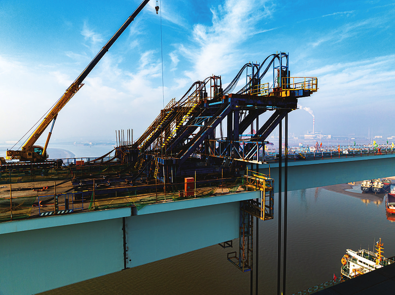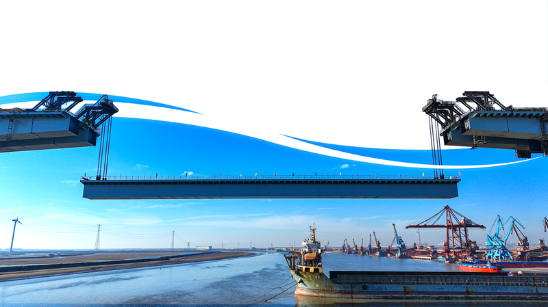 由于项目地处渤海入海口,大型浮吊受限于通航宽度无法驶入。为攻坚千吨重钢梁托举难题,项目团队研发了智能吊挂一体机,实现了混凝土悬臂浇筑与钢梁吊装的智能化、自动化作业和施工全过程的智能控制与监测。这一创新成果为复杂大跨桥梁施工带来了全新解决方案。