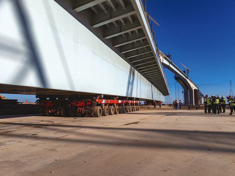 套尔河特大桥全长4334米,主跨跨径达338米,合龙段钢箱梁长127米,单幅宽12.5米,重量达1200吨。
