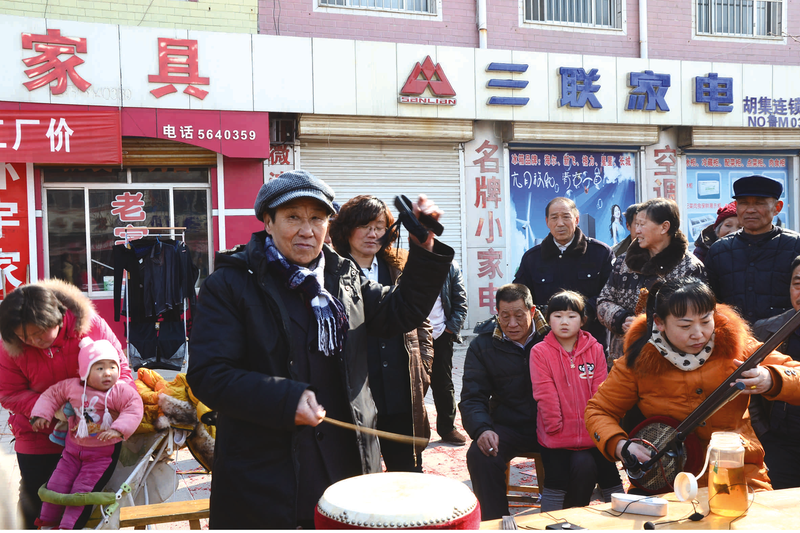 ▲2015年胡集书会,苗士芹演唱,师父石景芬伴奏。(李振平/摄)