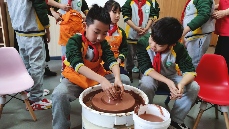 陶艺体验区,王禄禄老师细致讲解着陶艺的制作技巧,孩子们围坐四周,迫不及待地动手尝试。稚嫩的小手在陶土间游走,将一块块质朴的泥土塑造成形态各异的作品,或是憨态可掬的小动物,或是简约实用的小杯子,每一件都凝聚着孩子们无限的想象力与创造力。陶艺体验让他们在触摸泥土的过程中,领悟到传统陶艺的深厚底蕴。