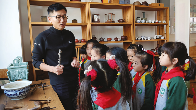 锔瓷体验区,静谧的氛围中弥漫着专注与认真。阮彬贤老师神情专注,手中拿着锔瓷工具,细致入微地介绍锔瓷这一古老技艺。为了让孩子们更直观地感受锔瓷文化的魅力,阮彬贤老师还将自己多年来悉心收藏的老物件一一拿出,与孩子们分享背后的故事。这些历经岁月洗礼的老物件,承载着锔瓷技艺的发展脉络,也勾起了孩子们对传统工艺的无限好奇。