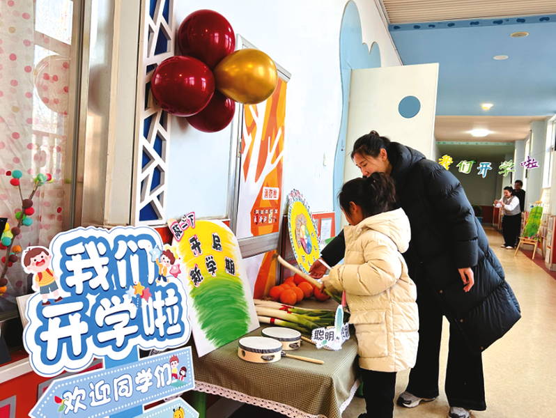 在沙河幼儿园,欢乐跳格子、猜灯谜、集百福米、写百家姓等各种传统游戏接续进行,让孩子们通过游戏感受着传统文化的魅力。校园有“蛇年”打卡区,用一张张写真照片放大每一幕幸福。在里则街道中心幼儿园,老师们将精心编织的红色春绳系于孩子腕间。中海幼儿园举办成长教育课,教师们组织了“敲出成长的力量”“摸高成长墙”“定格成长印记”等活动。
