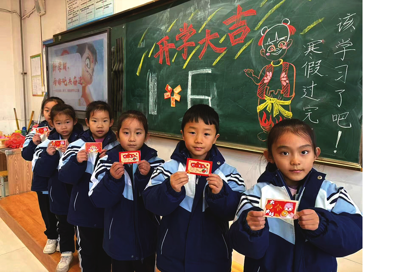 在阳信县第一实验学校,老师们通过童趣化、生活化的活动设计,让教室焕然一新。有的课桌上整齐摆放了新课本和气球,寓意“元气满满、欣欣向荣”;有的摆放了蔬菜,寓意特“蔬”宠爱非你莫“蔬”,愿你,“葱”明伶俐、“芹”劳勇敢、心想“柿”成;有的孩子还收到老师的“红包”,里面是老师对大家新学期的殷切期望……