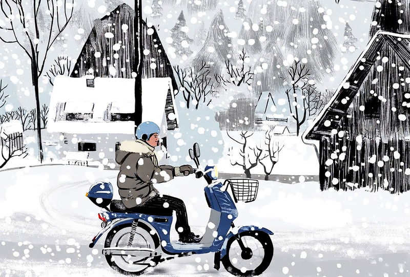 那时虽没长到现在的身高,也近一米八了。电动车和现在的相似,大概是矮座的款式。我想握住车把,就只能先弓下腰,然后再向后蹬地。走得快一些便可以慢跑起来,那就不得不加大前倾的幅度。熟练些后燃起了希望,我又想起外公做的香喷喷、热腾腾的午饭,涌上心头的暖流瞬间驱散了浸骨的寒意。可天不遂人愿,此时狂风大作,天上飘起了雪花。我边跑,边望向天空,灰蒙蒙一片中多了一些颗粒般的小点,它们并不是雪花,而是湿漉漉的冰碴子。不出几个呼吸,我就睁不开眼了,别说抬头看天,连平视也成了难事,于是只好低下头盯着非机动车道上的白线前进。