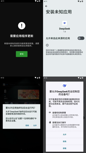 诱导用户“更新”(左上)、诱导用户安装“带毒”子安装包(右上)、诱导用户授权其后台运行(左下)、诱导用户授权其使用无障碍功能(右下)。 近日,国家计算机病毒应急处理中心和计算机病毒防治技术国家工程实验室依托国家计算机病毒协同分析平台在我国境内捕获发现仿冒DeepSeek官方App的安卓平台手机木马病毒。