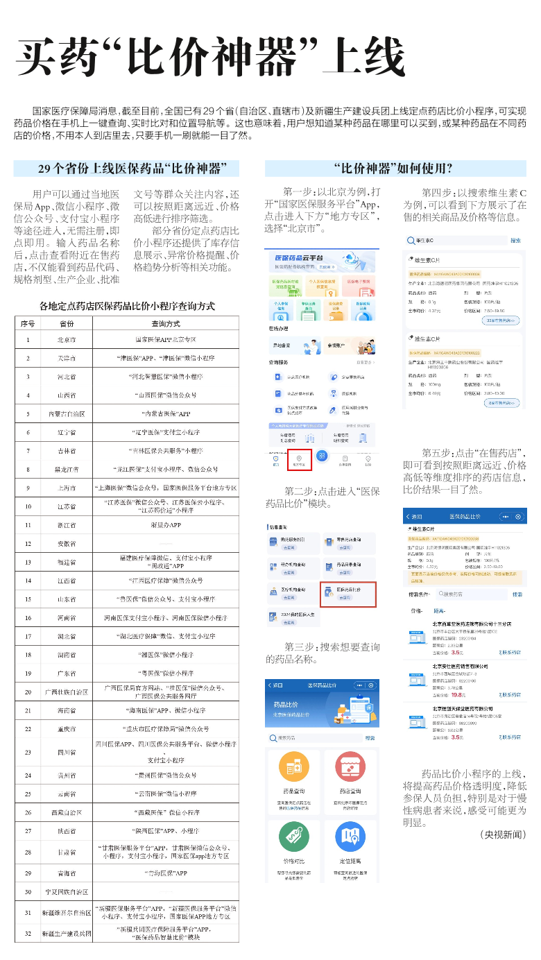 国家医疗保障局消息,截至目前,全国已有29个省(自治区、直辖市)及新疆生产建设兵团上线定点药店比价小程序,可实现药品价格在手机上一键查询、实时比对和位置导航等。这也意味着,用户想知道某种药品在哪里可以买到,或某种药品在不同药店的价格,不用本人到店里去,只要手机一刷就能一目了然。