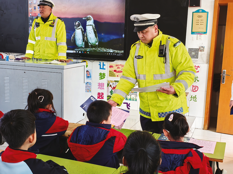 晚报讯 近日,邹平市公安局交警大队抓住辖区中小学春季开学这一有利时机,组织民辅警走进校园,以“小手拉大手,安全伴我行”为主题,为广大家长和师生上了一堂堂生动的交通安全“开学第一课”。
