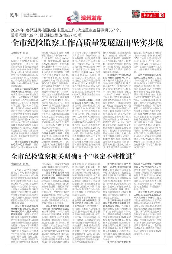 2月24日,记者在市政府新闻办召开的“抓改革创新促高质量发展——亮目标”主题系列新闻发布会市纪委监委机关、市委巡察办联合场获悉:2025年,全市纪检监察机关将以一往无前的奋斗姿态、永不懈怠的精神状态,不断开辟新时代新征程纪检监察工作高质量发展新局面,为谱写中国式现代化最美滨州篇章提供更加坚实可靠的政治、纪律和作风保障。