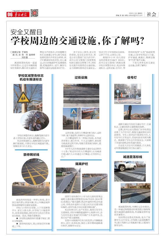 根据《中小学、幼儿园安全防范要求》(GB/T 29315),滨州公安交警部门积极设置学校区域警告标志、机动车限速标志、过街设施、信号灯、禁停网状线等“五类”基础管理设施,以及学校周边人行道、护学通道、减速丘、隔离设施等“四类”提升设施。