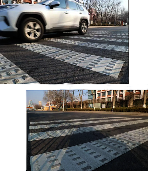 减速震荡标线,车辆经过会有震动,是一种通过物理震动和视觉提示强制驾驶员减速的道路标线,形成触觉和听觉的双重警示。