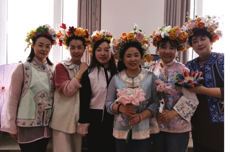 簪花制作区诗意流淌,指导老师将普通扭扭棒化作立体绒花,教师们发髻间的摇曳生姿。
