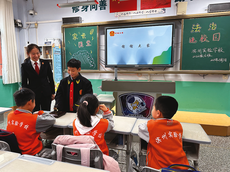 晚报滨州讯 3月7日,滨州实验学校22级16班星河逐梦中队的教室闪耀着别样的法治光芒。滨城区人民法院张法官、曹法官化身“法治引路人”,为少先队员们开启了一场沉浸式法治启蒙之旅。