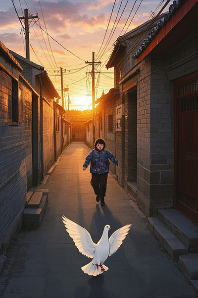 恍惚间又回到童年,夕阳落山,我正在胡同巷子里跑着,追着那只陪了我四年的白鸽。那时我六岁,身上穿着花棉,棉袄的四个口袋里,都装满了玉米粒。