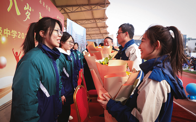 教师代表送上殷切寄语,一句句鼓励与嘱托,如同一盏盏明灯,照亮了学生前行的道路。家长代表则倾诉着舐犊情深,回忆着孩子成长的点点滴滴,真挚的话语数次引发全场共鸣,许多人的眼眶都不禁湿润了。当学生代表手捧鲜花,向教师们献上敬意,全体学生向师长鞠躬致谢时,热烈而持久的掌声在校园上空回荡。
