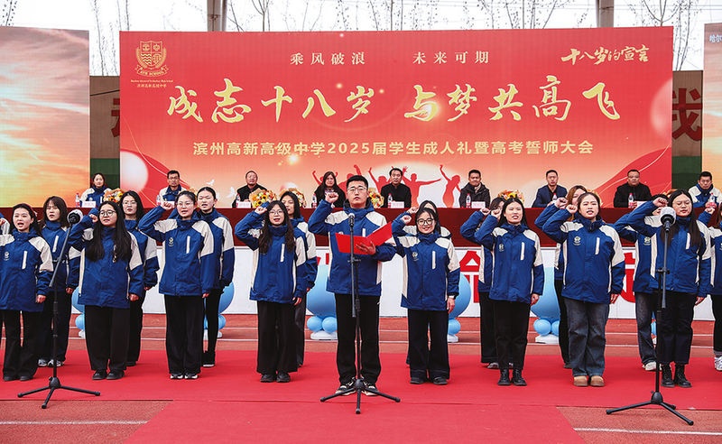 晚报讯 3月15日,滨州高新高级中学的田径场上洋溢着青春和喜悦,“成志十八岁与梦共高飞”——2025届学生成人礼暨高考誓师大会隆重举行。