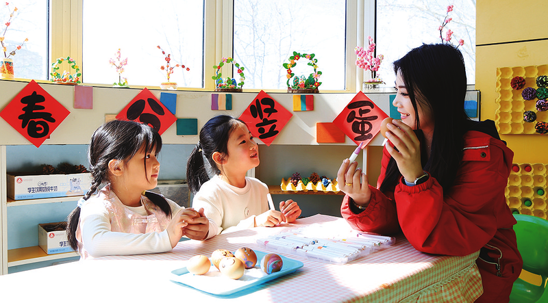 晚报讯 3月20日,在阳信县实验幼儿园,孩子们正在玩“立蛋”游戏。