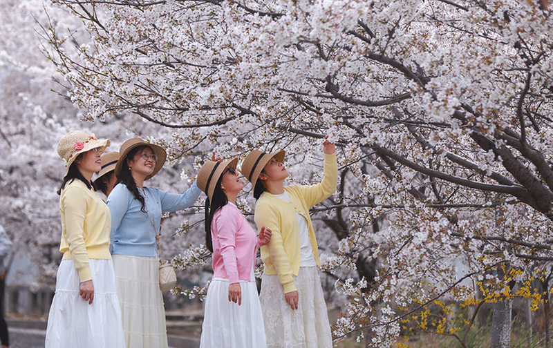 步入景区,仿佛置身于童话世界。洁白如雪的白樱清雅高洁,如霜似雾;粉樱则娇艳欲滴,若霞锦流云,与青山碧水相映成趣,构成一幅动人的春日画卷。微风拂过,花瓣纷飞,游客们纷纷举起手机、相机,记录下这转瞬即逝的浪漫时刻。