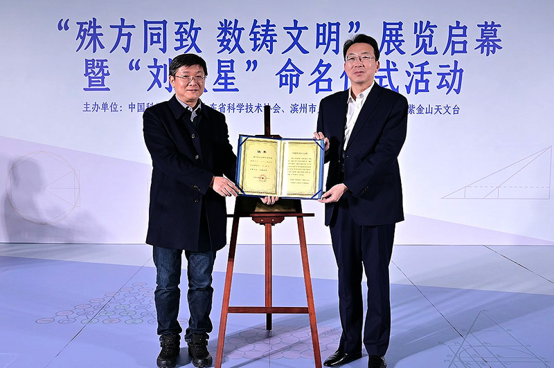 当年12月23日,“殊方同致 数铸文明”展览启幕暨“刘徽星”命名仪式在中国科技馆二层恐龙广场成功举办。活动由中国科技馆、山东省科协、滨州市人民政府、中国科学院紫金山天文台联合主办。启幕仪式上,南京紫金山天文台正式向滨州颁授“刘徽星”证书,滨州市委副书记刘忠远、南京紫金山天文台副台长吴雪峰共同为“刘徽星”揭牌。