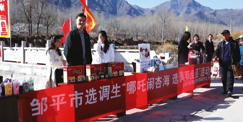为宣传推介当地特色农产品,当地相关部门在杏花节现场设置了特色农产品展销区,让游客在赏花游玩之余,可以购买地道的“鹤伴果缘”酸枣汁、“鹤伴磨坊”石磨面粉等特色农产品。西董街道郭家峪村村书记助理屈文月介绍:“我们郭家峪村的‘鹤伴果缘’酸枣汁是用山上采摘的野生酸枣,加工制成的绿色健康饮品。当然,我们郭家峪村还有其他农产品,比如‘鹤伴磨坊’石磨面粉和野生酸枣仁。我们非常希望通过此次杏花节活动,让更多人认识郭家峪,了解郭家峪的特色农产品。”