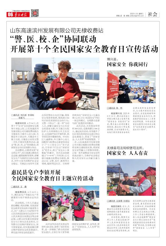 晚报滨州讯 4月14日,在第十个“4·15”全民国家安全教育日来临之际,山东高速滨州发展有限公司无棣收费站联合无棣县车王镇中心幼儿园、无棣县车王派出所、无棣县车王镇卫生院、无棣县公安局交警一中队开展宣传教育活动,通过“警、医、校、企”协同联动,将国家安全知识送到群众身边。