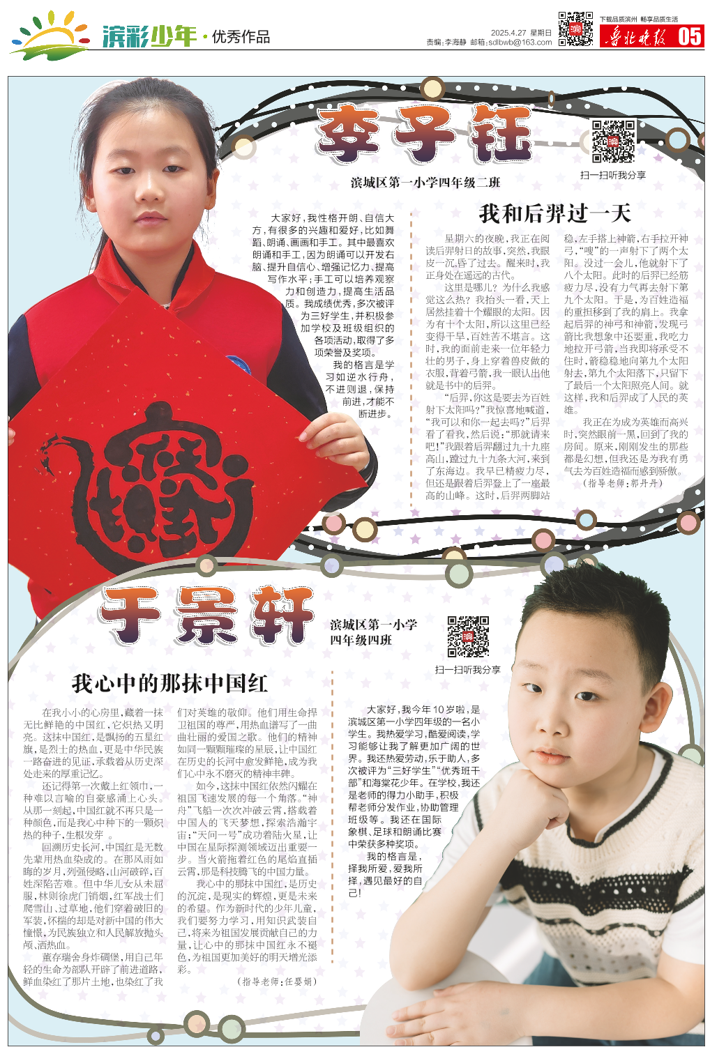 大家好,我今年10岁啦,是滨城区第一小学四年级的一名小学生。我热爱学习,酷爱阅读,学习能够让我了解更加广阔的世界。我还热爱劳动,乐于助人,多次被评为“三好学生”“优秀班干部”和海棠花少年。在学校,我还是老师的得力小助手,积极帮老师分发作业,协助管理班级等。我还在国际象棋、足球和朗诵比赛中荣获多种奖项。