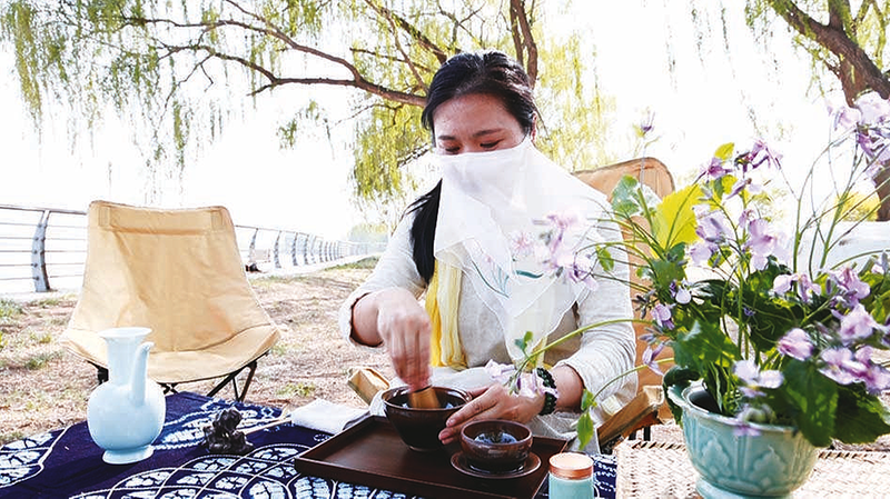 在不远处,还有一场团体户外露营活动。活动中,人们身着传统服饰,将场景布置得十分优雅。在这里,大家不仅能够欣赏大自然的美景,还能沉浸式体验非遗茶道、香道的独特魅力。