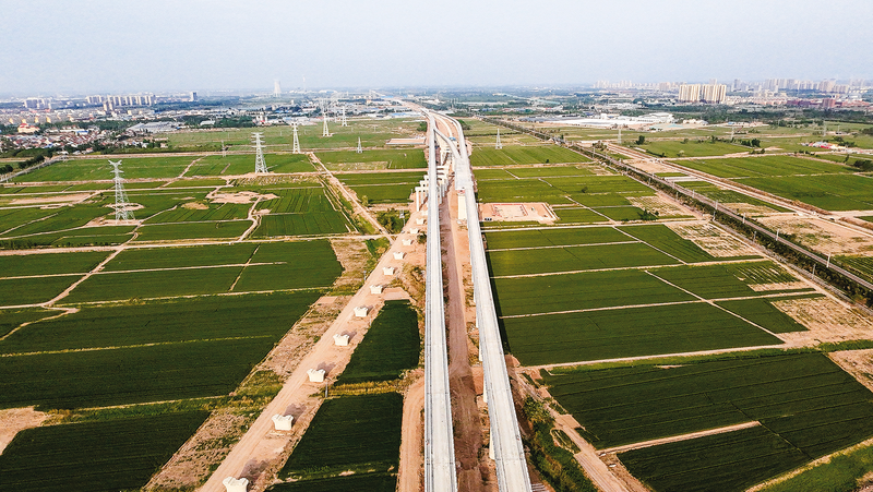 高铁高架桥横跨绿油油的麦田,桥影与麦浪相映,勾勒出一幅美丽的画卷。想象一下,待高铁通车后,列车穿梭于碧波麦浪间,风驰电掣与田园诗意在此相遇,定会是一道动人心弦的独特风景。