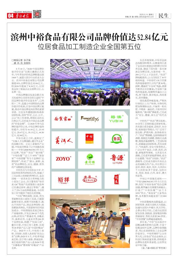 5月10日,“2025中国品牌价值评价信息”在浙江德清正式发布,今年参加评价的品牌数量达到1068个,涵盖大部分行业的龙头企业。滨州中裕食品有限公司品牌强度833,品牌价值达52.84亿元,较2024年提高了8.34亿元,位居食品加工制造企业全国第五位、山东第一位。