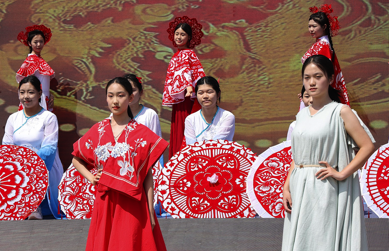 活动现场,结合剪纸工艺、老粗布服饰,进行T台展示。