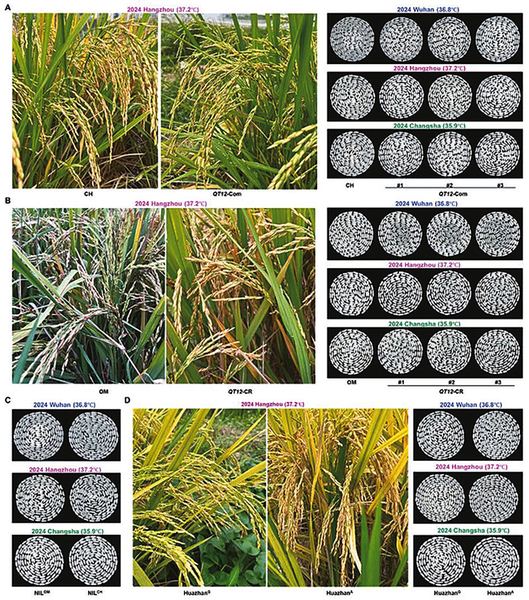 此外,QT12基因导入到杂交稻品种“华占”,显著提高了其结实率、单株产量和稻米品质,使产量分别增加了49.1%、77.9%和31.2%,进一步验证了其在高温环境下的育种实力。