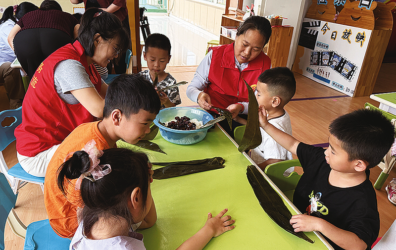 “粽子要包得紧,就像军人保卫祖国一样坚定不移。”在包粽子现场,军属与孩子们围坐成“粽香小分队”,退役老兵志愿者赵新边说边手把手教孩子们卷粽叶、填糯米、扎棉绳,耐心引导他们用稚嫩的小手制作出形状各异的粽子,接受传统文化教育。