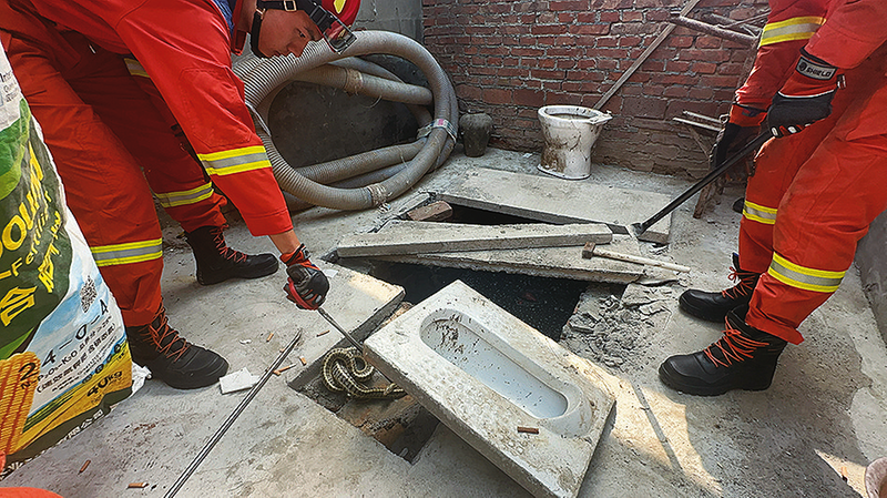 消防救援人员到达村民家中发现,一条花蛇正藏匿在卫生间蹲坑的下水道处。经过仔细勘查,确认该蛇属于无毒的菜花蛇。在做好个人防护后,消防救援人员用铁锤配合撬棍把卫生间水泥板及蹲坑撬开,利用捕蛇器迅速将蛇夹进编织袋中。最终,这位“不速之客”被带至远离村庄的地方安全放生。