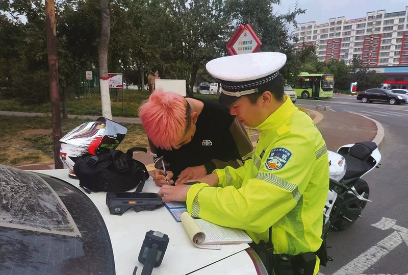 案例一:5月22日18时04分,经开交警一中队民警在黄河二路渤海十三路巡逻时,一辆车牌号为鲁M2***3的摩托车,由远及近驶来,声音轰鸣刺耳,打破了道路的平静。