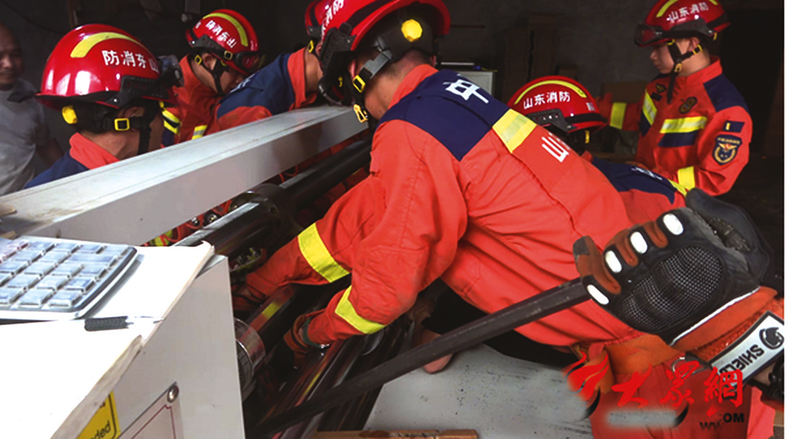近日,在邹平市好生街道办事处马家村一工厂,一名工人右手被卡在压纸机内,急需救援。市消防救援支队指挥中心接到报警后,立刻调派邹平市韩店消防救援站赶赴现场救援。