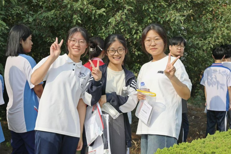 第一场,语文考试结束后,走出考场的孩子们大多神情淡定。比如在滨州一中考点,第一个走出考点的学生,神态自若地向场外人群致意,双手高举,面带微笑,宛如明星。有的性格活泼的孩子或是接受采访,或是开心交流:“我猜到了,就是这类作文题目:家国情怀!”“是啊,从历史到现实,从诗歌到科学,有很多东西可以写……”