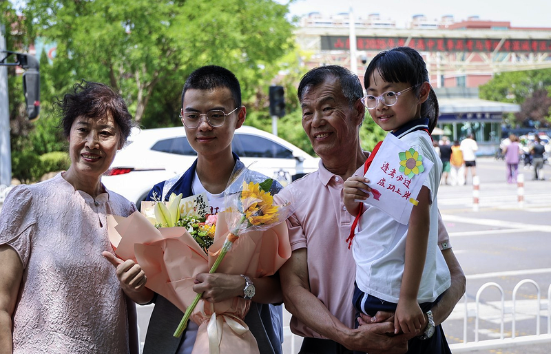 考点外,迎接孩子们的,是鲜花、掌声、拥抱。大多数考生神态很松弛,有的比出胜利手势,有的叽叽喳喳开着玩笑,有的主动和家长拥抱,在考点外开心合影。也有的考生终于卸下心理包袱,笑中有泪,倾诉着三年高中苦读的不易。