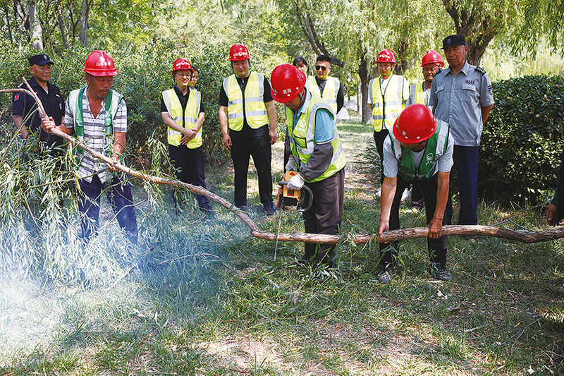 第一场防汛防台风应急演练在彩虹湖公园进行。巡查人员发现大型乔木倒伏阻断交通后,立即启动三级应急响应;抢险组迅速设置警示标志,油锯手用油锯在安全距离内切割断枝;支撑组同步对倾斜树木进行加固处理。全体人员10分钟内完成了主干道清障,有效检验了预警响应、多部门协同和次生灾害防控能力。