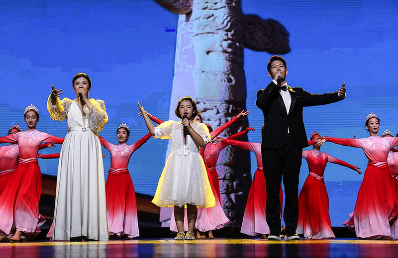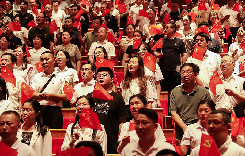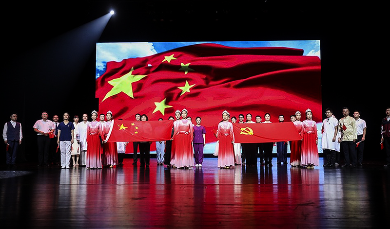 当《歌唱祖国》音乐响起,全体人员齐声高唱,并挥舞手中的党旗、国旗,用歌声表达对党的无限热爱与祝福。