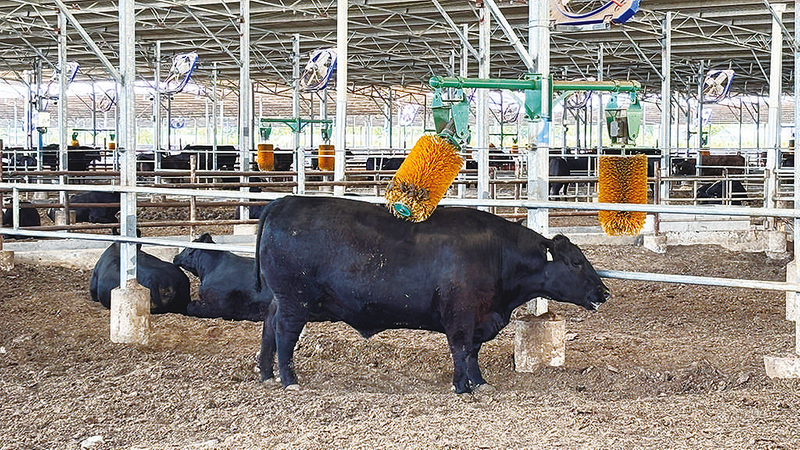 当天室外最高温度达35℃以上,但牛舍内的温度舒适宜人,牛儿或悠闲地吹着风扇,或细嚼慢咽地吃着草料,还有的在享受着机械按摩。