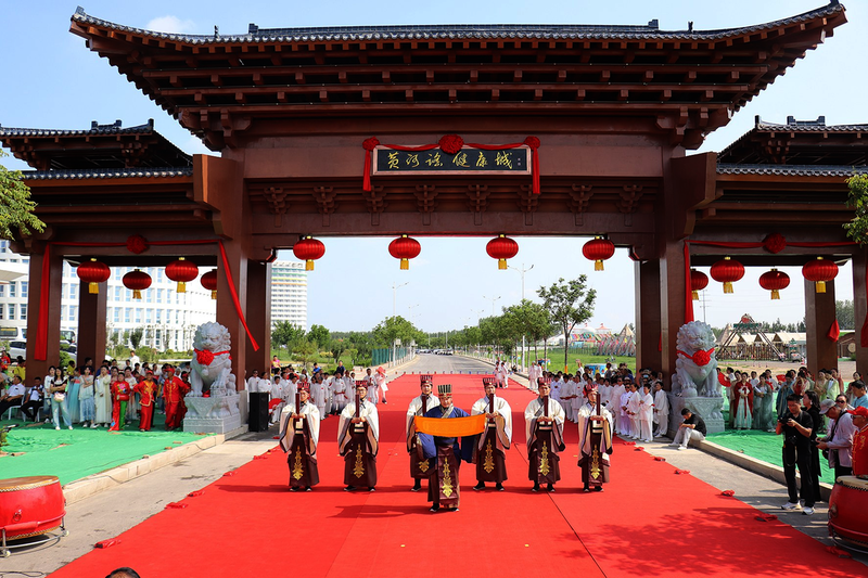 上午7时58分,盛典在热烈的传统民俗表演中拉开序幕。活动的首个高潮聚焦于新建成的黄河谣健康城牌坊。活动主持人、市文旅推介官曹宁对牌坊楹联“揽长河入画,翠垄摘云,银滩戏雪,万物生机凝此境;谱乐土成谣,椿萱焕彩,兰桂腾芳,千门喜色洽其天”进行了深入解读,阐释其蕴含的“天人合一”健康理念与对美好生活的追求。