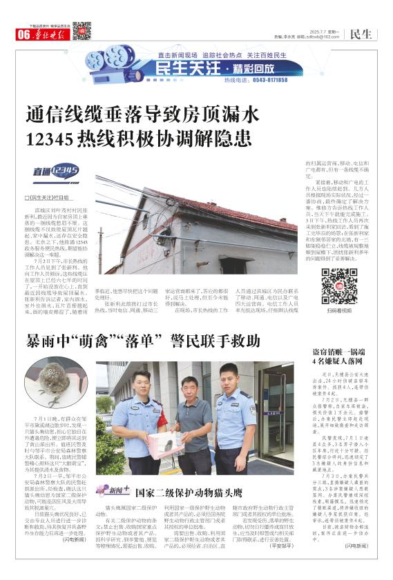 通信线缆垂落导致房顶漏水 12345热线积极协调解隐患