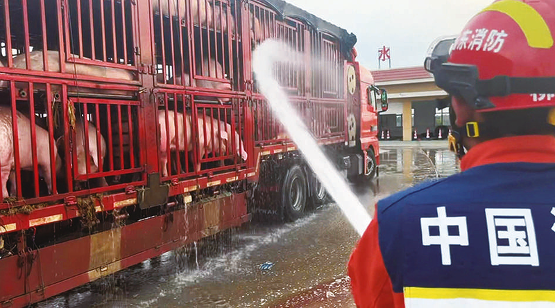 7月5日,无棣县秦滨高速东服务区一辆满载生猪的货车在运输途中由于天气炎热,阳光暴晒,车上的生猪出现中暑症状,若不及时降温解暑,生猪将濒临死亡。市消防救援支队指挥中心接到报警后立即调派人员赶往现场。