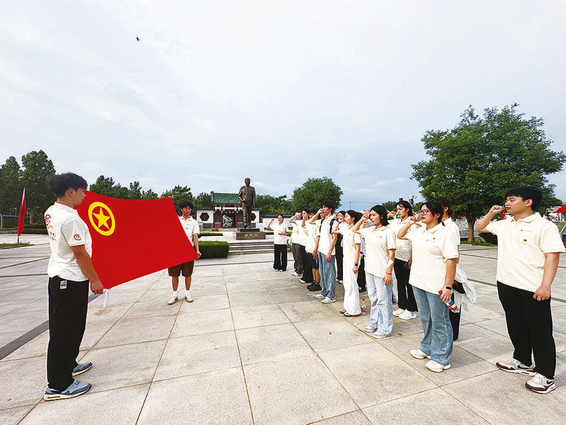 为纪念中国人民抗日战争暨世界反法西斯战争胜利80周年,队员们走进渤海革命老区纪念园和杨柳雪“不忘初心”党性教育基地。在英名碑前,他们肃立鞠躬、敬献鲜花;在周恩来雕像前,重温入团誓词,领会杰出楷模精神,体悟初心使命。
