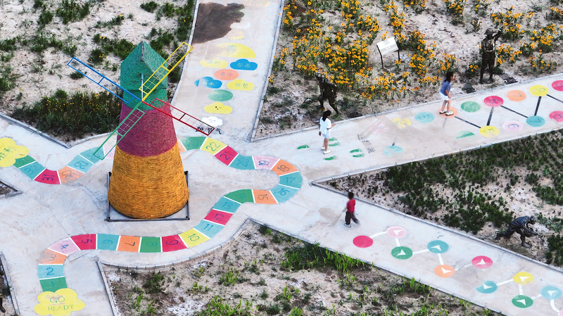 晚报讯 暑假期间,阳信县水落坡镇因承办滨州“村BA”吸引了大批游客前来体验田园风光,寻觅童年记忆。近日,在水落坡镇刘古良村田园景观带,游客陪伴孩子体验20世纪80年代的传统体育游戏——跳房子(又称跳方格)。