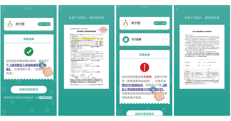 网上问诊筛查异常的小学新生、其他学段完成网上问诊筛查的入学新生,需携带打印好的《新生入学结核病筛查TST检测告知书》,到在筛查系统内预约的医疗机构完成TST检测。