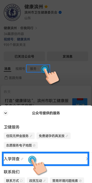 1. 关注滨州市卫生健康委员会官方微信公众号“健康滨州”,点击功能菜单“入学筛查”,进入滨州新生结核病筛查系统。
